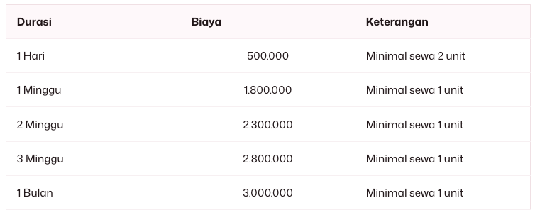 Kami sangat jujur dalam memberikan penawaran harga. Berikut adalah estimasi biaya sewa di tempat kami.