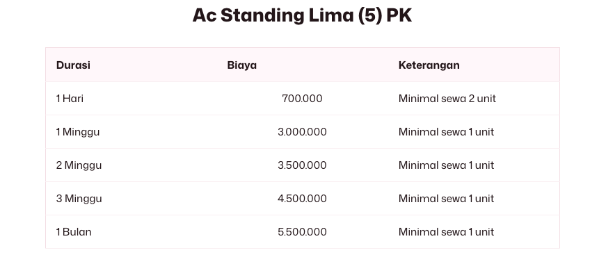 AC standing dengan kapasitas besar biasanya memiliki harga sewa lebih tinggi daripada AC portable.