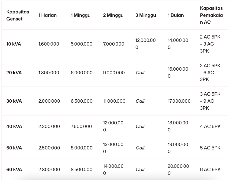 Di antaranya adalah besaran kapasitas daya (kVA), durasi pemakaian unit, lokasi geografis acara, serta tingkat kesulitan instalasi kabel.